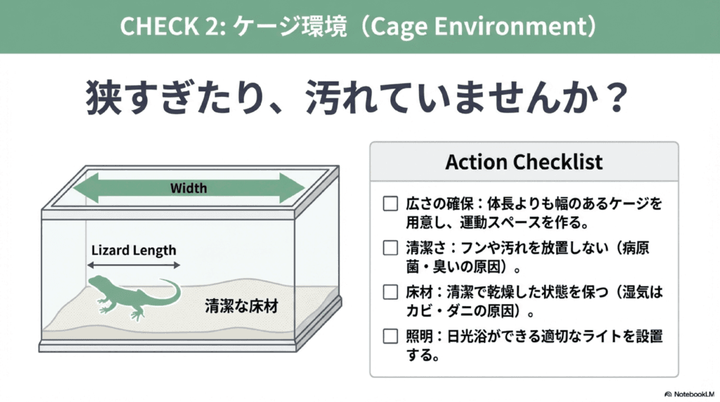- 定期的にケージを掃除する。 ケージ内に適切な照明を設置する。