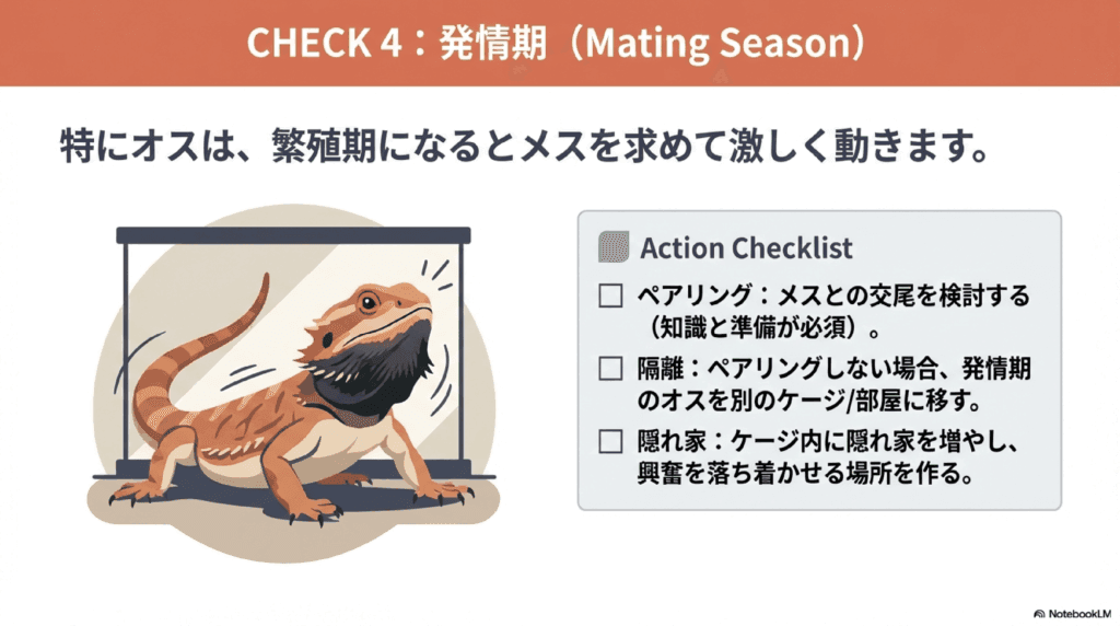 オスのフトアゴヒゲトカゲは、繁殖期になるとメスを求めて活発に動き回り、ケージを激しく叩いたり、ガラスを登ったりすることがあります。発情期の対策としては、以下の方法があります。