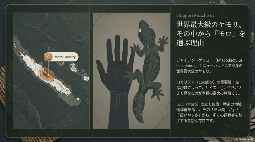 ジャイアントゲッコー(学名:Rhacodactylus leachianus)は、ニューカレドニアに生息する世界最大級のヤモリです。その中でも「モロ(Moro)」は、特定のロカリティ(生息地域)に由来する個体群を指します。