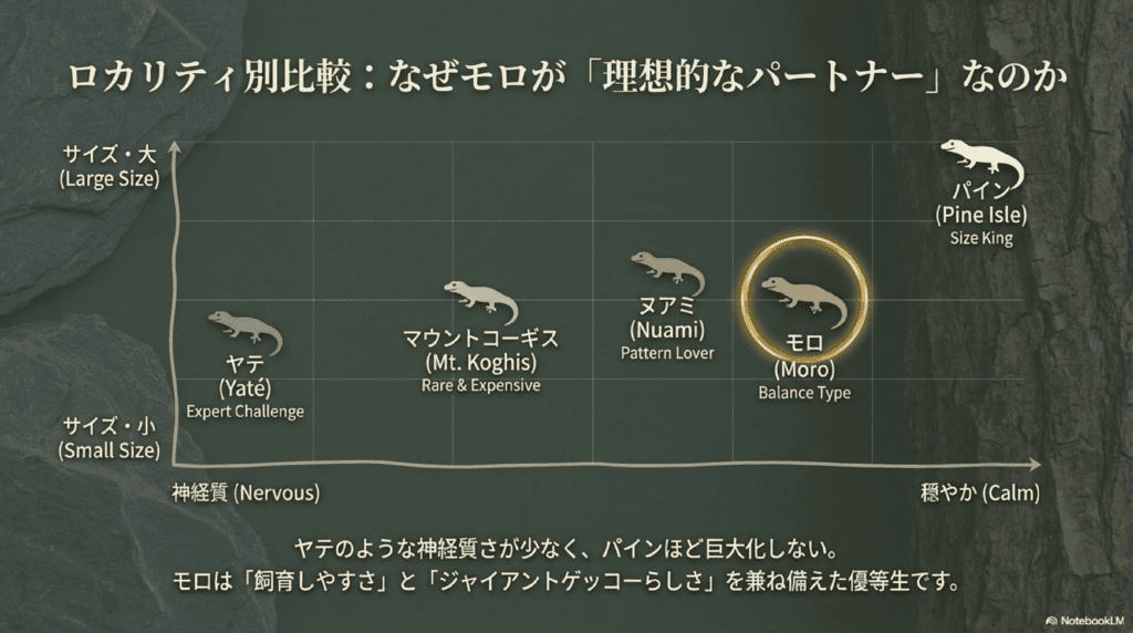 ジャイアントゲッコーには複数のロカリティがあり、それぞれに異なる特徴を持ちます。モロと他の代表的なロカリティとの違いを比較してみましょう。