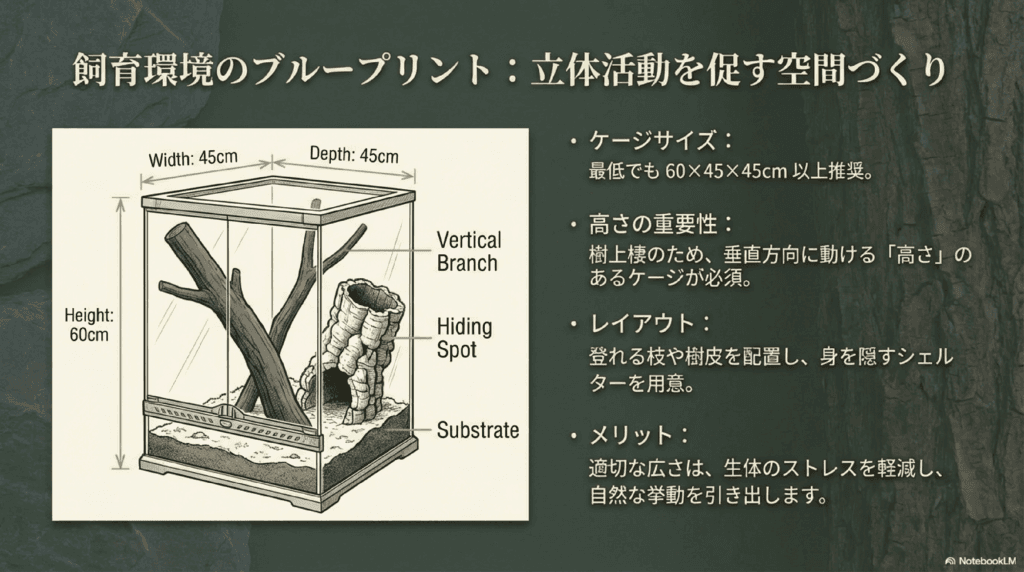 モロは比較的大きな体を持つため、広めのケージが必要です。最低でも60×45×45cm程度のサイズのケージを選ぶことをおすすめします。高さがあるケージを選ぶことで、垂直に登ることができ、自然に近い環境を再現できます。ケージには登れる枝や樹皮、隠れ場所を作るためのシェルターも配置しましょう。