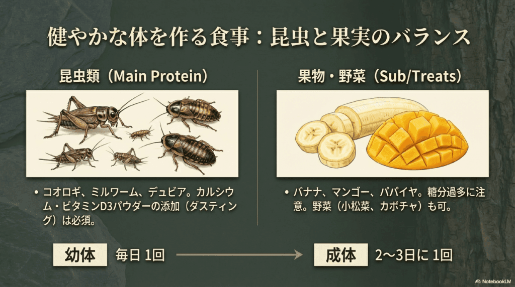 主に与えるべきエサはコオロギやミルワーム、デュビアローチ(ゴキブリの一種)などの昆虫です。これらの昆虫は高タンパクで栄養価が高いですが、栄養バランスを保つために、与える昆虫にも多様性を持たせることが大切です。昆虫は必ずカルシウムやビタミンD3を含んだ粉末で粉砕し、飼育個体に与えることを忘れないようにしましょう。