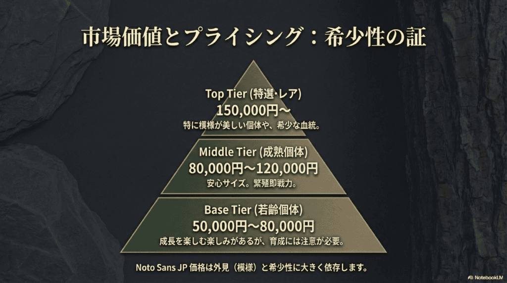 - 希少な個体や特に美しい模様の個体:150,000円以上になることもあります