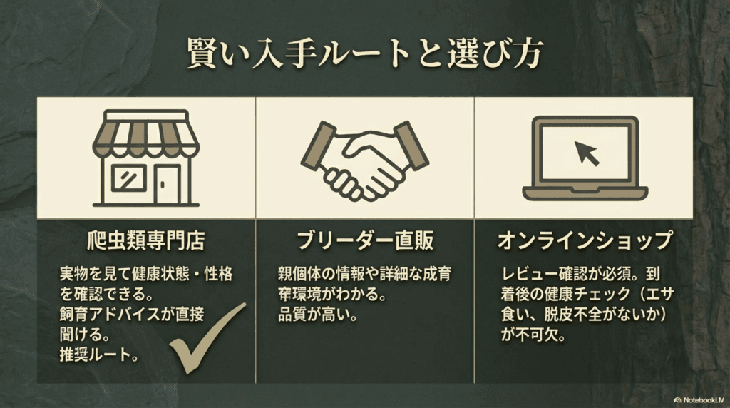 多くの都市には爬虫類専門店があり、ジャイアントゲッコーを取り扱っています。実際に個体を見て選ぶことができるため、購入前に健康状態や性格を確認することができます。また、専門店では飼育に関するアドバイスももらえるので、初心者にも安心です。