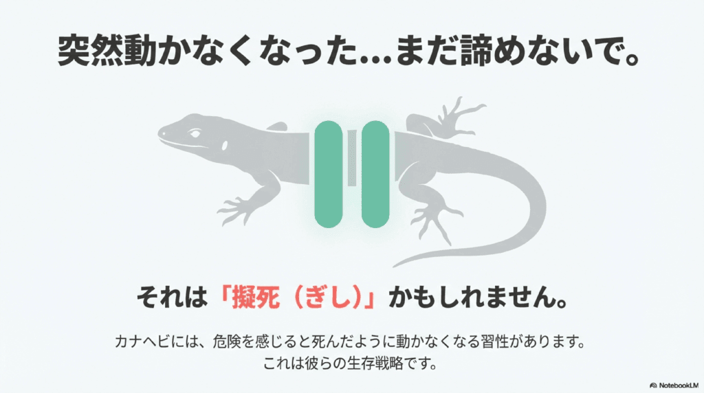 カナヘビが仮死状態になるというのは、擬死(ぎし)と呼ばれる現象です。擬死とは、動物が危険を感じた時に、まるで死んだかのように動かなくなる防御行動です。カナヘビの場合は、捕食者から襲われたと感じると、心拍数や呼吸を極限まで落とし、体を動かなくすることで、相手を欺こうとします。
