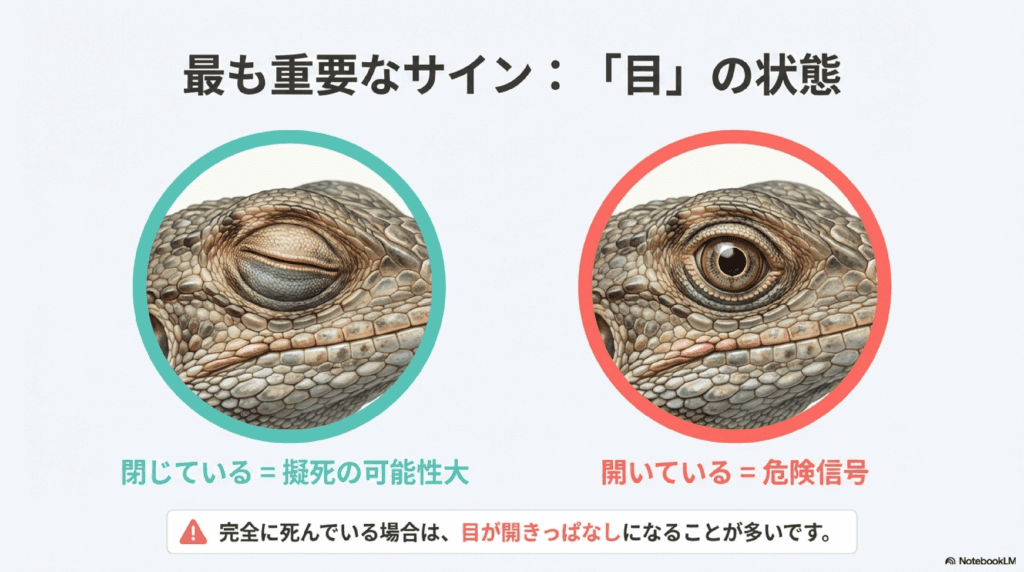 仮死状態中のカナヘビは、目は閉じていることが多いです。しかし、完全に死んでしまったカナヘビは、目が開いたままになっていることがあります。