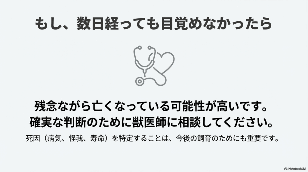 もし、数日経っても復活しない場合は、獣医師に相談することをおすすめします。