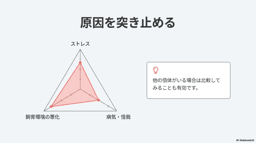 飼育環境に問題がないか、もう一度確認してみましょう。考えられる問題点としては、以下のようなものが挙げられます。