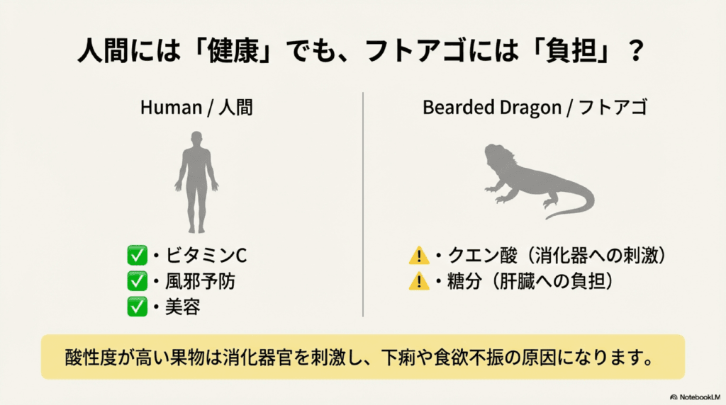 特に、酸性度が高い果物はフトアゴの消化器官を刺激してしまう可能性があり、下痢や食欲不振の原因になることもあります。