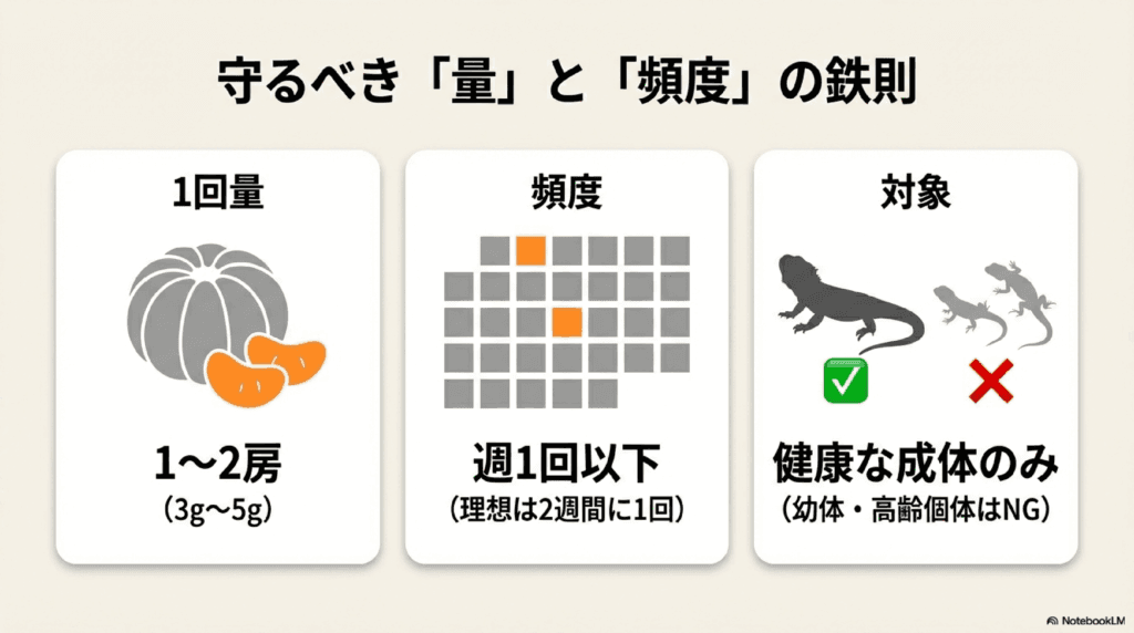 フトアゴヒゲトカゲにみかんを与えるときは、「少量・低頻度」が鉄則です。