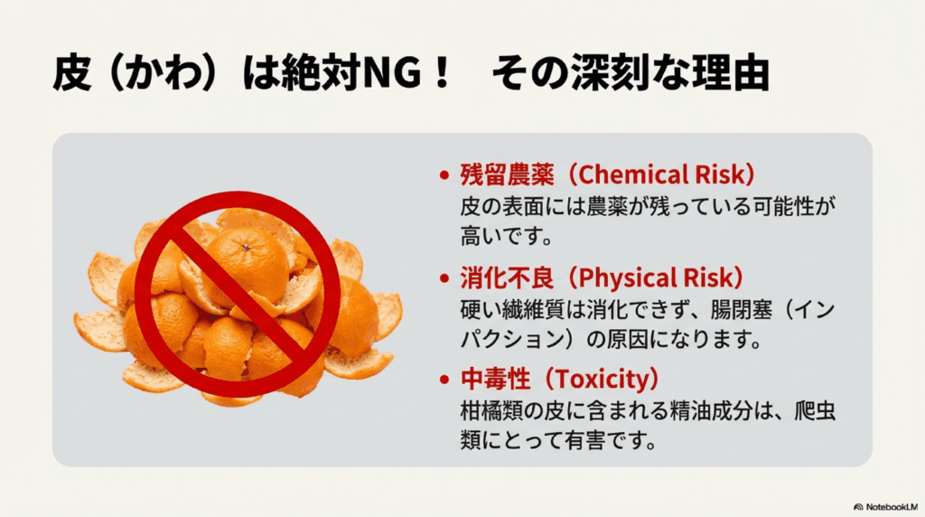 - 柑橘系の皮には精油成分が含まれ、フトアゴに有害になることもある