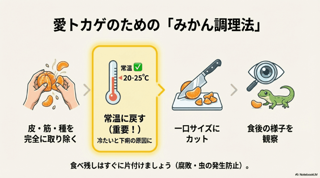 みかんを与える際には、以下のような工夫をするとより安全で、食べやすくなります。