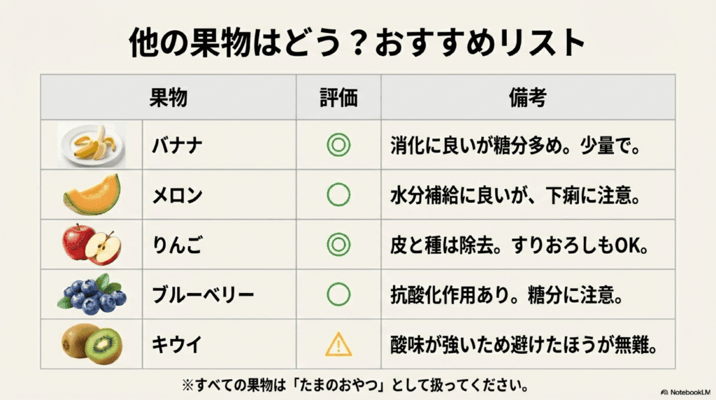 どの果物にも共通するのは、「少量・不定期」が鉄則ということ。特に、糖分と酸味が強い果物は胃腸への負担が大きいため、与える際は個体の体調と反応を観察しながら慎重に行いましょう。