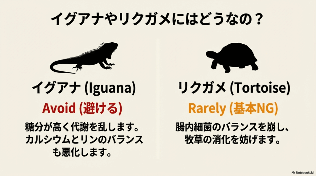 とくに、成長期の若いイグアナや、病後の個体、妊娠中のメスには避けたほうが無難です。