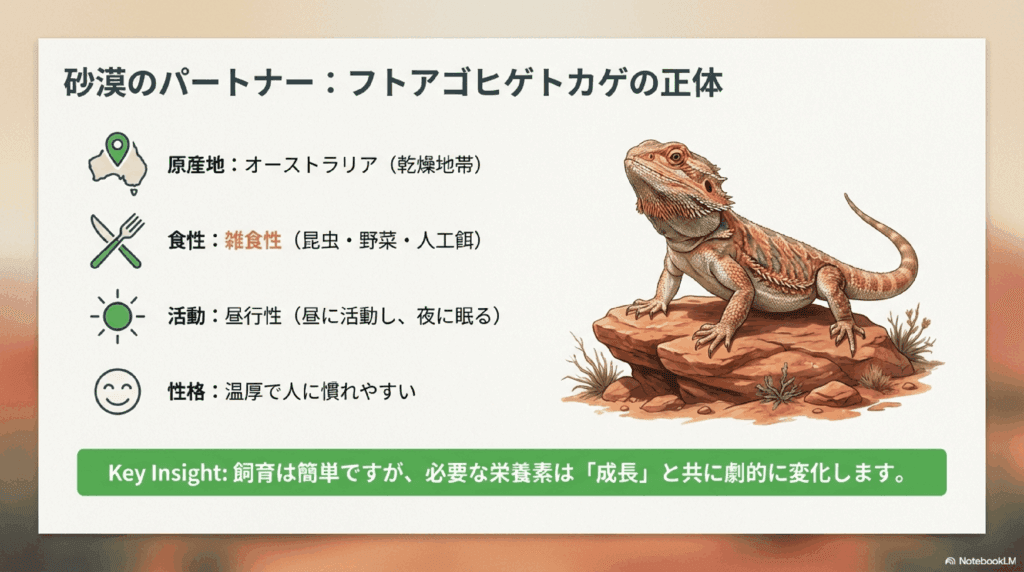 フトアゴヒゲトカゲは雑食性で、昆虫や野菜、人工餌をバランスよく与える必要があります。ただし、年齢によって必要とされる栄養バランスは大きく異なります。