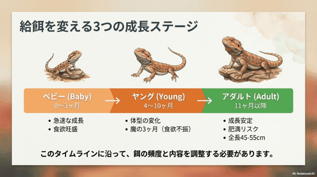 フトアゴヒゲトカゲは、ベビーからアダルトへと成長するにつれて、必要な栄養バランスや食欲が劇的に変化します。そのため、愛好家の間でささやかれる「魔の3ヶ月」を乗り越え、健康に育てるためには、成長段階に合わせた正しい給餌知識が欠かせません。