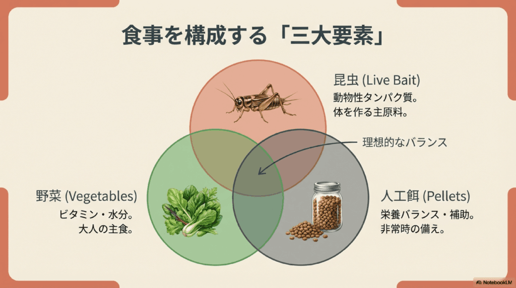 野菜中心の食生活へシフト。週に数回の昆虫+人工餌で栄養管理を。