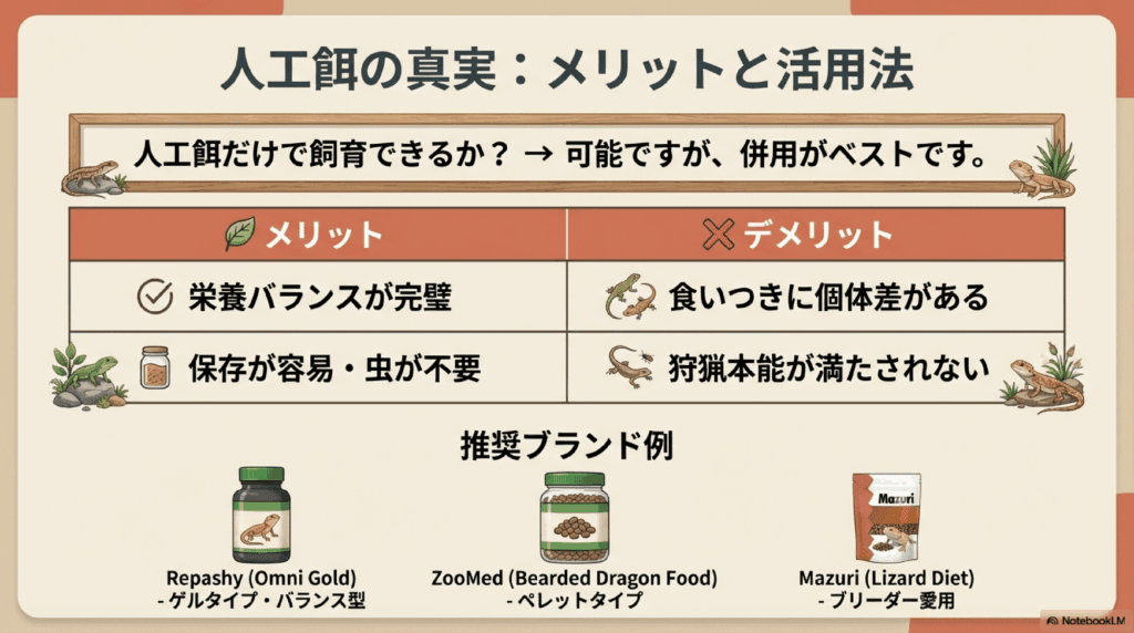 また、「フトアゴヒゲトカゲ 人工餌だけ」で検索される方も多いですが、完全に人工餌に頼るよりも、生餌や野菜と組み合わせる方が栄養バランスも良好です。