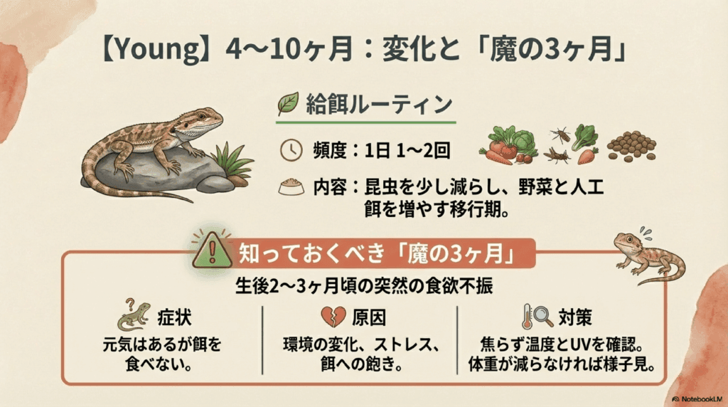 飼育者の間でよく言われる「魔の3ヶ月」とは、ベビー期からヤング期に差し掛かる時期(おおよそ生後2〜3ヶ月頃)に、急に食欲が落ちたり、餌をまったく食べなくなる現象を指します。