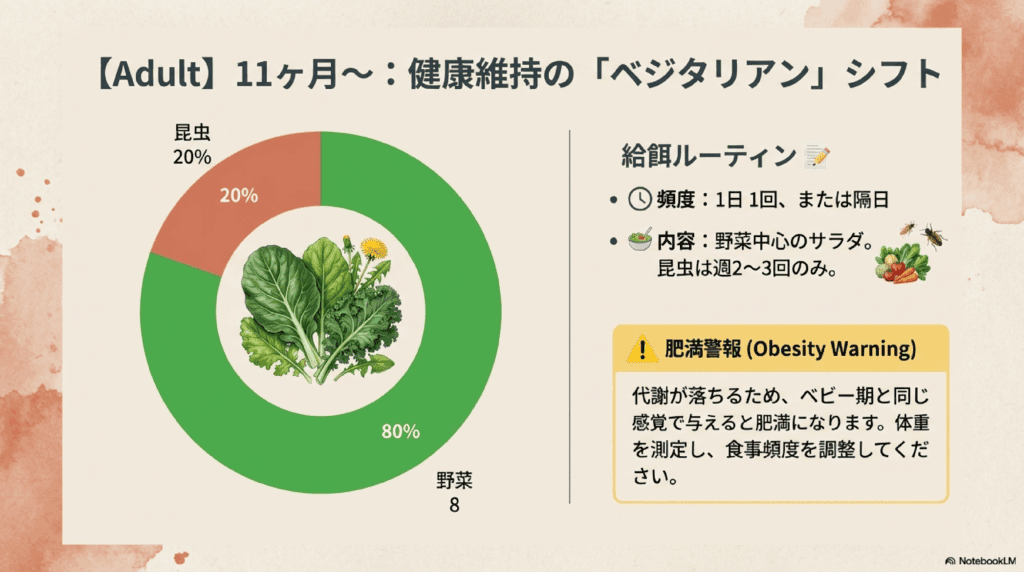 このタイミングで、餌の種類や回数を見直すことが重要です。特に、ベビー・ヤングの時期と比べて運動量も落ちるため、与えすぎには注意が必要です。