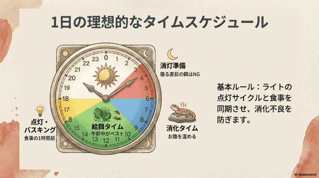 フトアゴヒゲトカゲは昼行性の爬虫類なので、餌を与えるタイミングも日中がベストです。特に、以下のようなリズムを意識すると、消化にも良く、体調管理がしやすくなります。