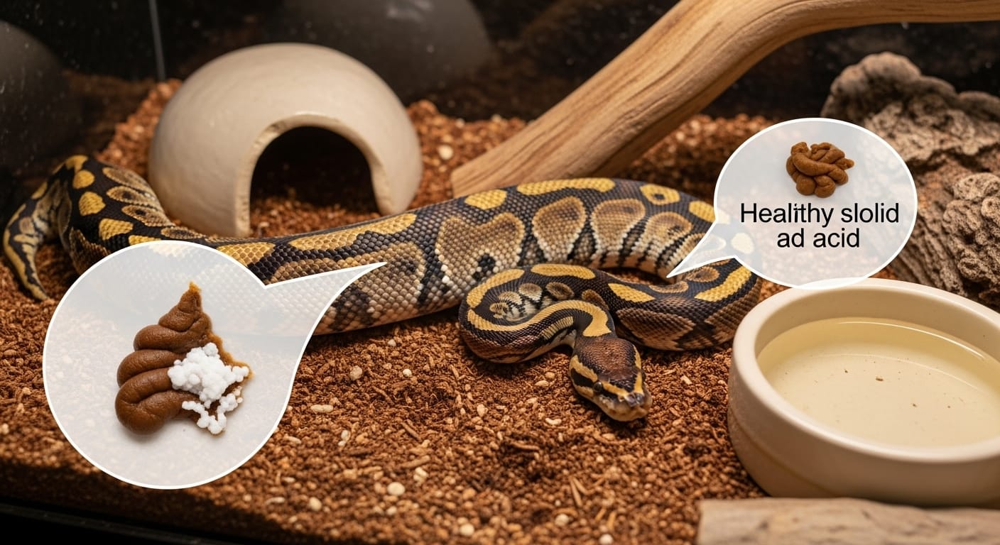 ボールパイソンは尿を液体ではなく「白い結晶状の尿酸」として排出します。これは腎臓で老廃物を濃縮する仕組みで、健康な証拠のひとつでもあります。