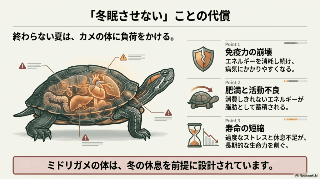 冬眠しないと、亀が過剰に活動し続け、消費しきれないエネルギーが脂肪として蓄積される可能性があります。これが肥満を引き起こし、健康に悪影響を及ぼすことがあります。