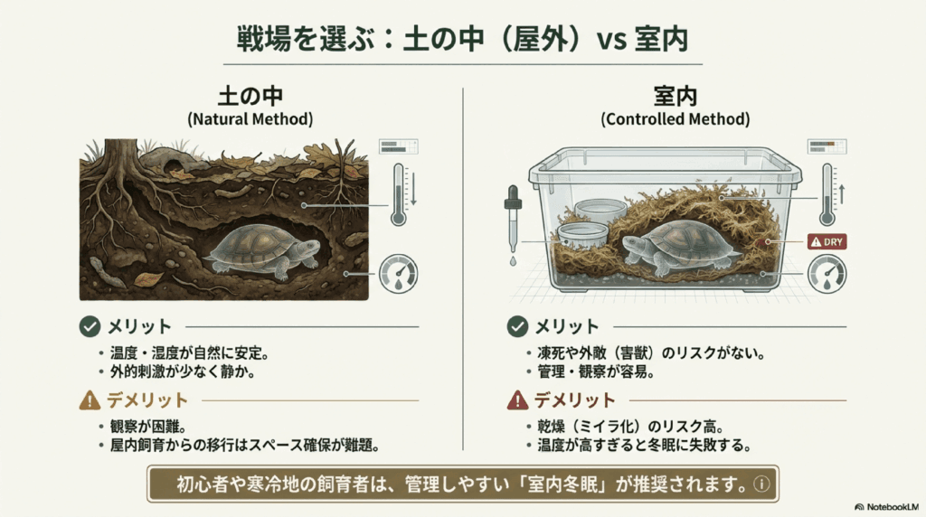 室内で冬眠を行う場合、亀の安全を確保するために温度や湿度をきちんと管理する必要があります。室内での冬眠は、特に寒冷地で飼っている場合には便利で、亀が凍死する心配がありません。また、屋内で冬眠をさせると、外部の危険から守ることができ、亀が静かに冬眠できる環境を提供できます。