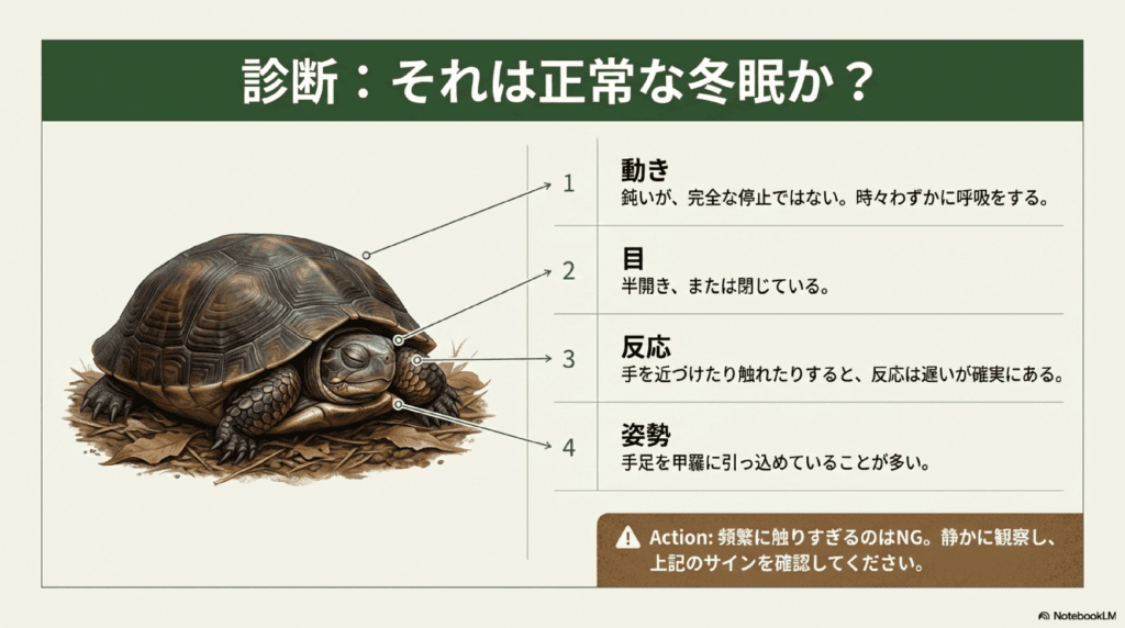 ミドリガメが冬眠に入っているかどうかを見分けることは、飼育者にとって非常に重要です。冬眠中のミドリガメは、通常の活動と比べて著しく活動が少なくなります。以下のような兆候を確認することで、冬眠状態にあるかどうかを見分けることができます。
