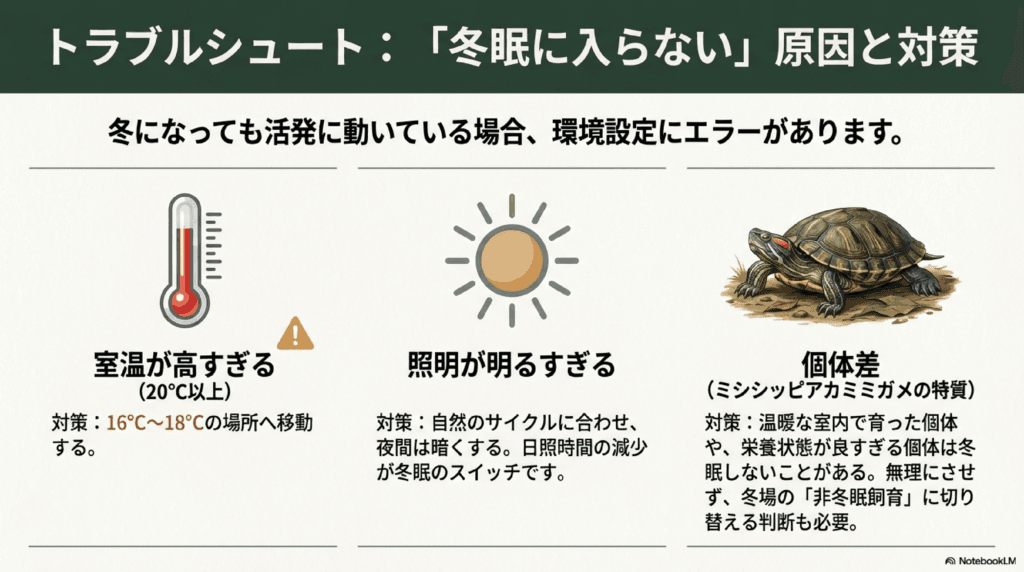 - ミシシッピアカミミガメの冬眠しない理由と対応方法