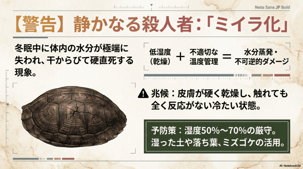 亀の冬眠には適切な湿度が必要ですが、湿度が極端に低いと、亀の体から水分が蒸発してしまい、乾燥してしまいます。冬眠場所が乾燥しすぎていると、亀はミイラのように硬直してしまうことがあります。