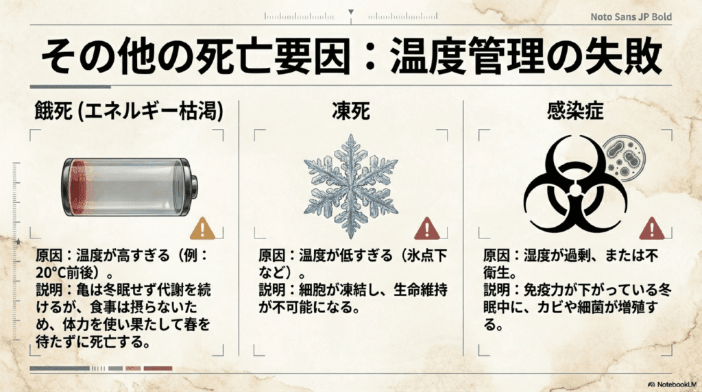 冬眠中のミドリガメが死亡する原因は、いくつかの要因が絡み合っています。健康管理や環境管理が適切でない場合、冬眠中に亀が命を落とすことがあるため、その兆候を早期に察知することが非常に重要です。以下は、冬眠中のミドリガメが死亡する可能性がある原因と、その兆候です。