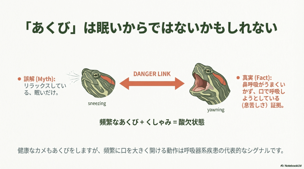 ミドリガメは「くしゃみ」と「あくび」をすることがありますが、これらにはどのような関係があるのでしょうか?