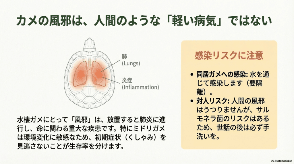 ここでは、亀の風邪の症状や原因、ほかの亀や人にうつる可能性について解説します。