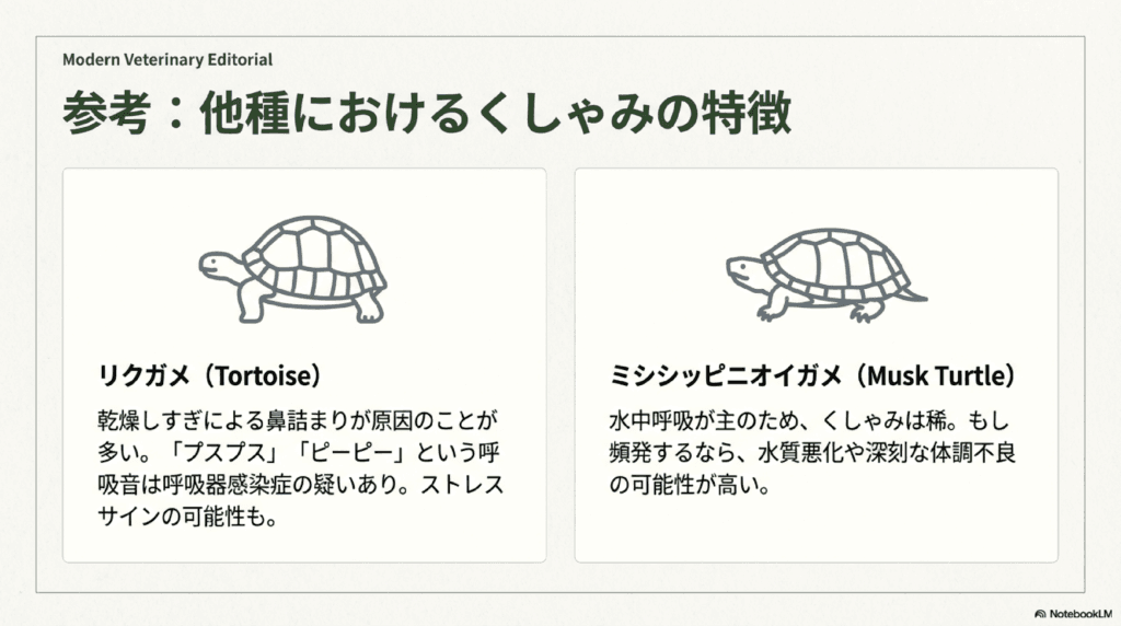 このように、亀のくしゃみは種類を問わず、病気や環境ストレスのサインであることが多いです。もし頻繁にくしゃみをする場合は、病気を疑い、飼育環境を見直すことが大切です。