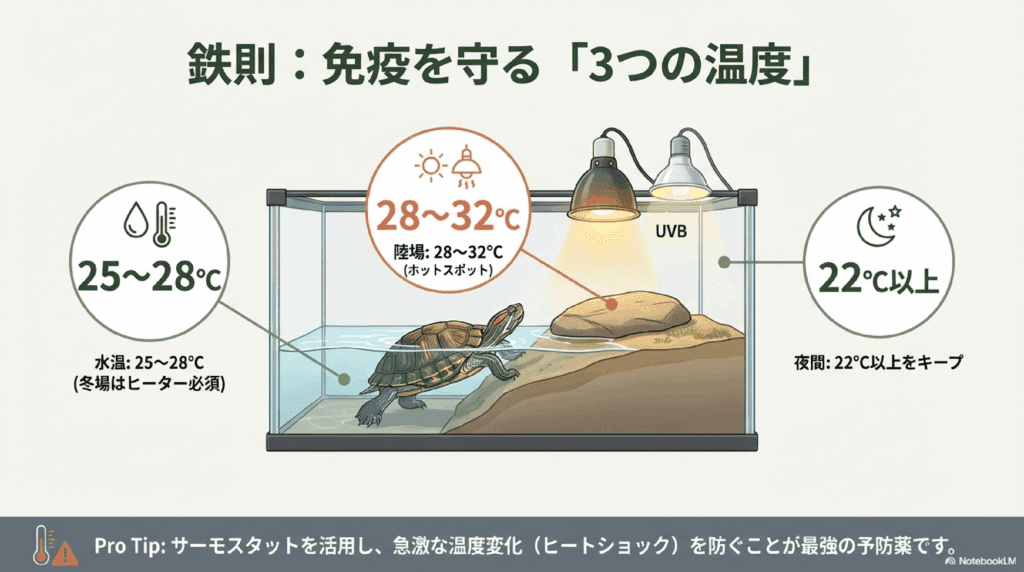 - 水温・気温の低下や急激な温度変化 → ヒーターやバスキングライトで温度管理を徹底