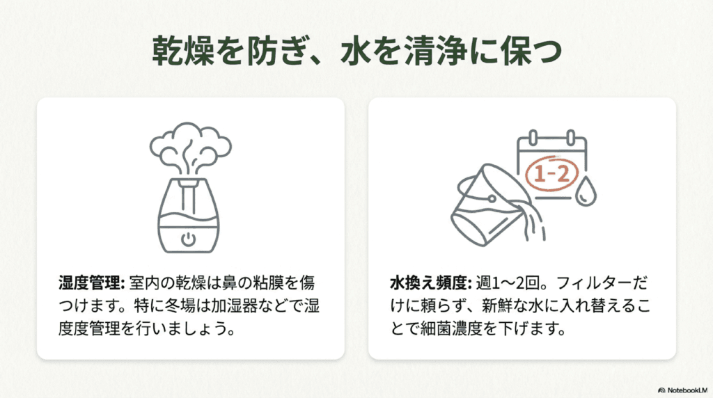- 水質の悪化 → こまめな水換えで清潔に保つ