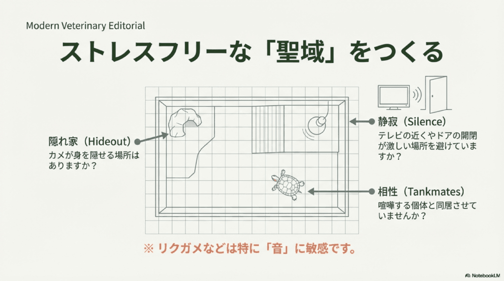 リクガメの場合、「音」に敏感でストレスを感じやすい個体もいるため、静かな環境を整えることが重要です。