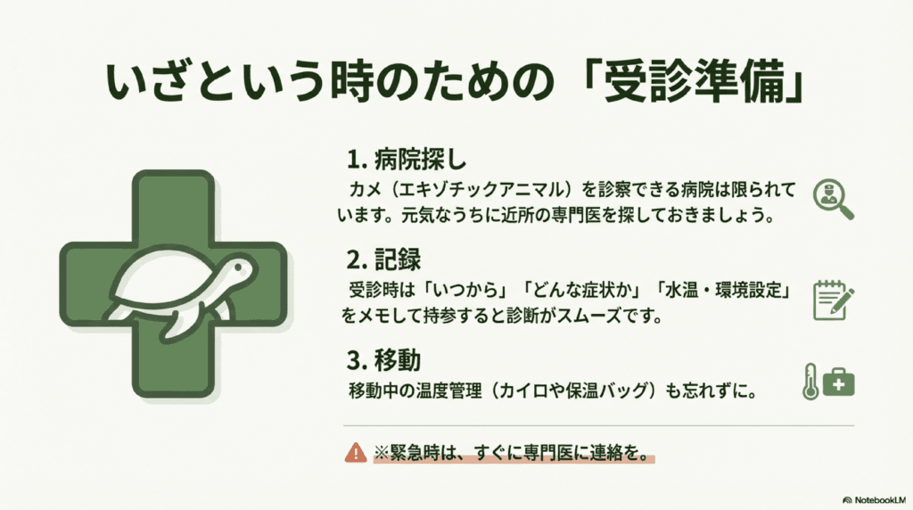 亀を診察できる動物病院は限られているため、普段からエキゾチックアニマルを診てもらえる病院を調べておくと安心です。